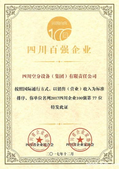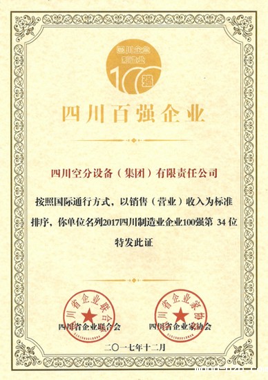 近日,我公司再次被四川省企业联合会、四川省企业家协会评为四川百强企业。按照国际通行方式,以销售(营业)收入为标准排序,我公司名列2017四川制造业企业100强第34位、2017四川企业100强第77位。