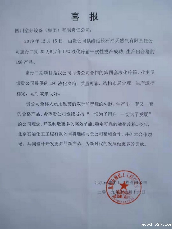 该项目的成功,对于填补天然气市场缺口、发展清洁能源、辐射带动当地地方经济具有十分重要的意义。标志着用户方成功跻身国内最大的LNG生产经营公司行列,也进一步夯实了我公司作为中国最大LNG冷箱制造企业的行业地位。为此,北京石油化工工程有限公司特向我公司发来喜报。