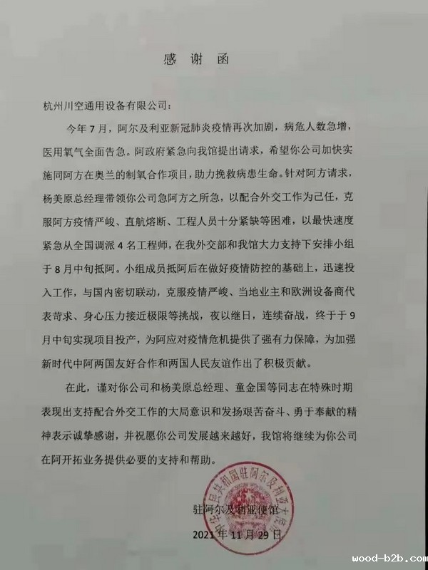 2021年11月29日,中国驻阿尔及利亚大使馆给我公司杭州川空发来感谢信,对杭州川空在新冠疫情十分严峻的情况下,克服困难支持阿方推动液体空分的投产,助力挽救病患生命所作出的努力表示感谢,对杭州川空杨美原总经理以及童金国等同志在特殊时期支持和配合外交工作的大局意识和发扬艰苦奋斗、勇于奉献的精神表示感谢。