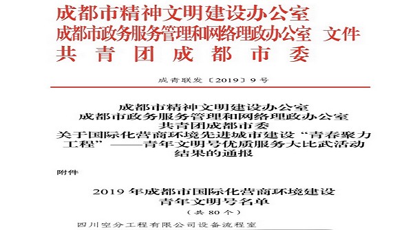 四川空分集团工程有限公司设备流程室荣获“2019年成都市国际化营商环境建设” 青年文明号称号